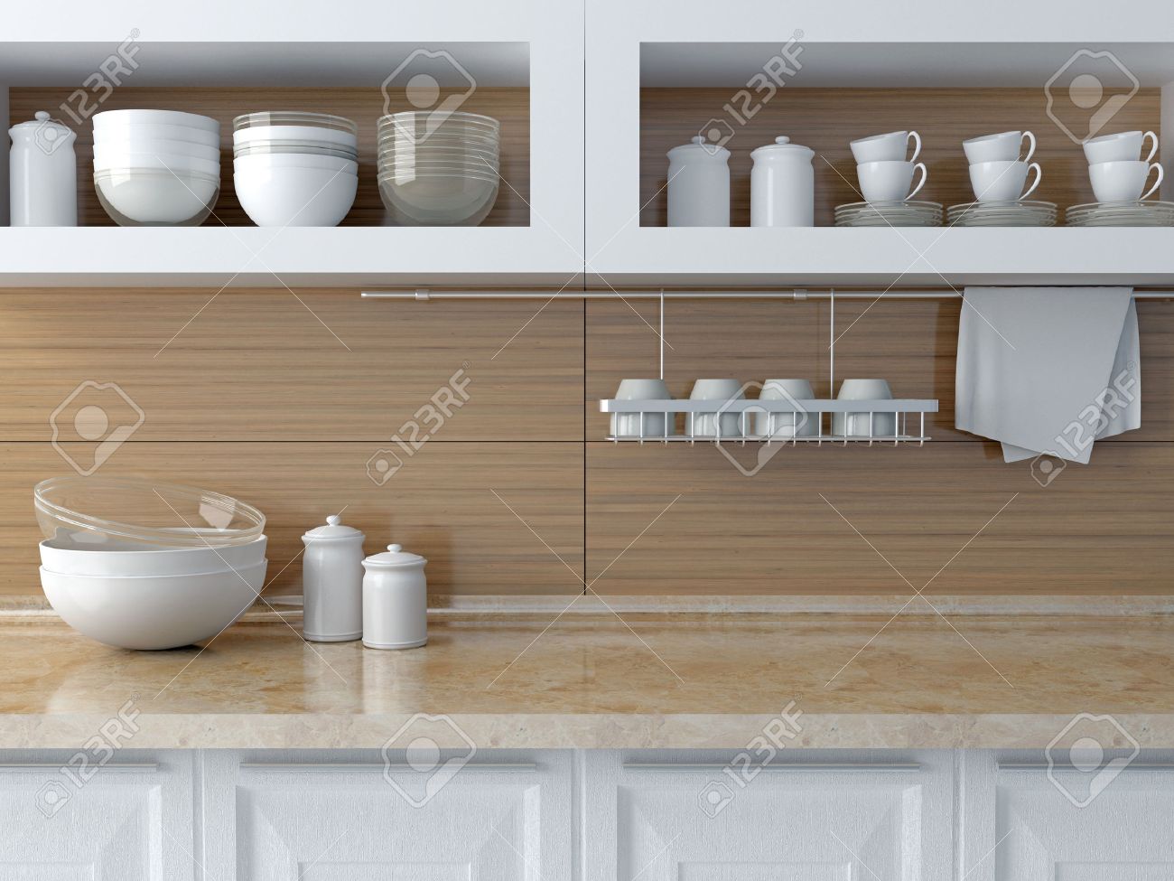 Modern Kitchen Design White Ceramic Kitchenware On The Marble