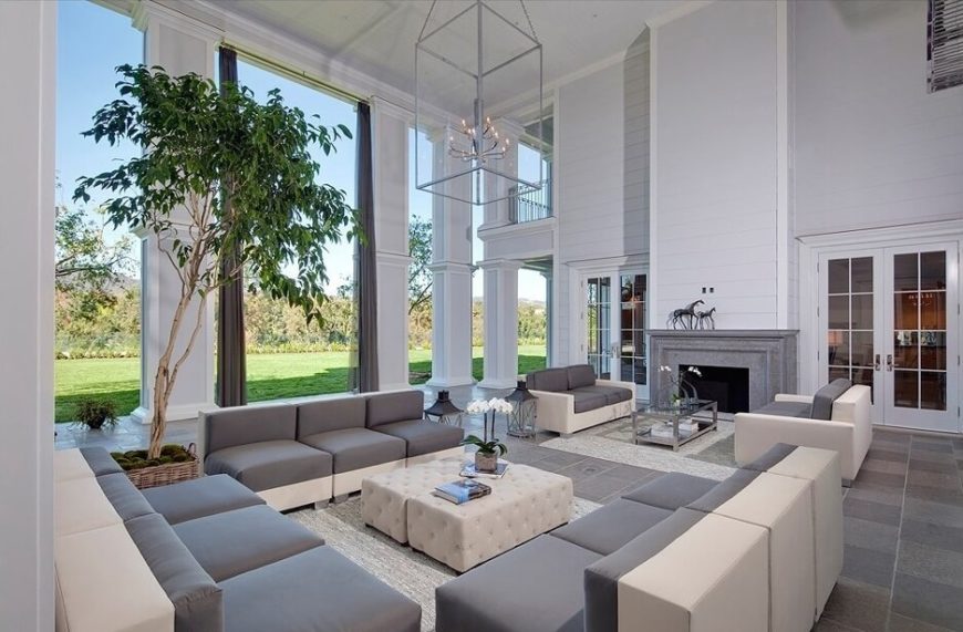 White Living Room Interior With Grey Corner Couch Green Fresh Plants